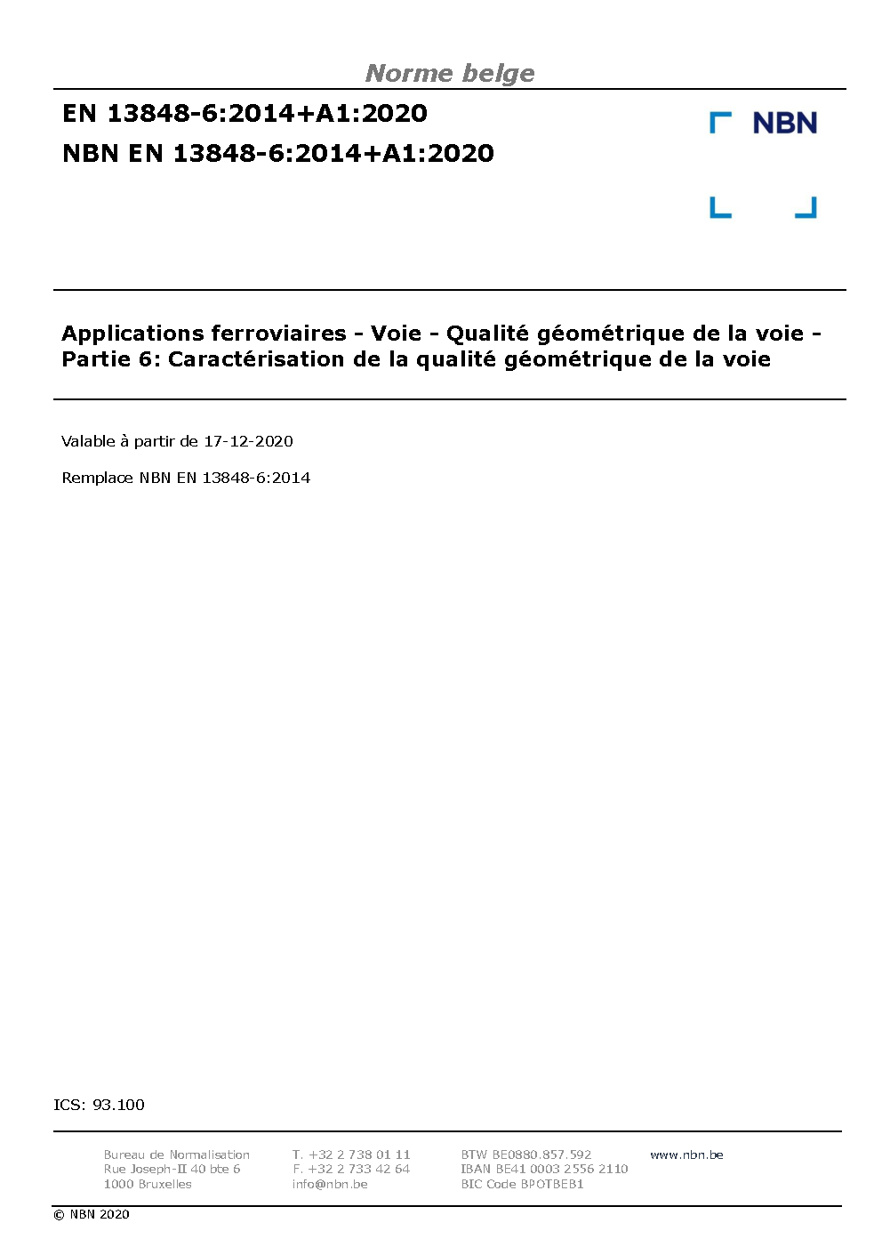 This European Standard characterizes the quality of track geometry based on parameters defined in EN 13848 1 and specifies the different track geometry classes which should be considered.