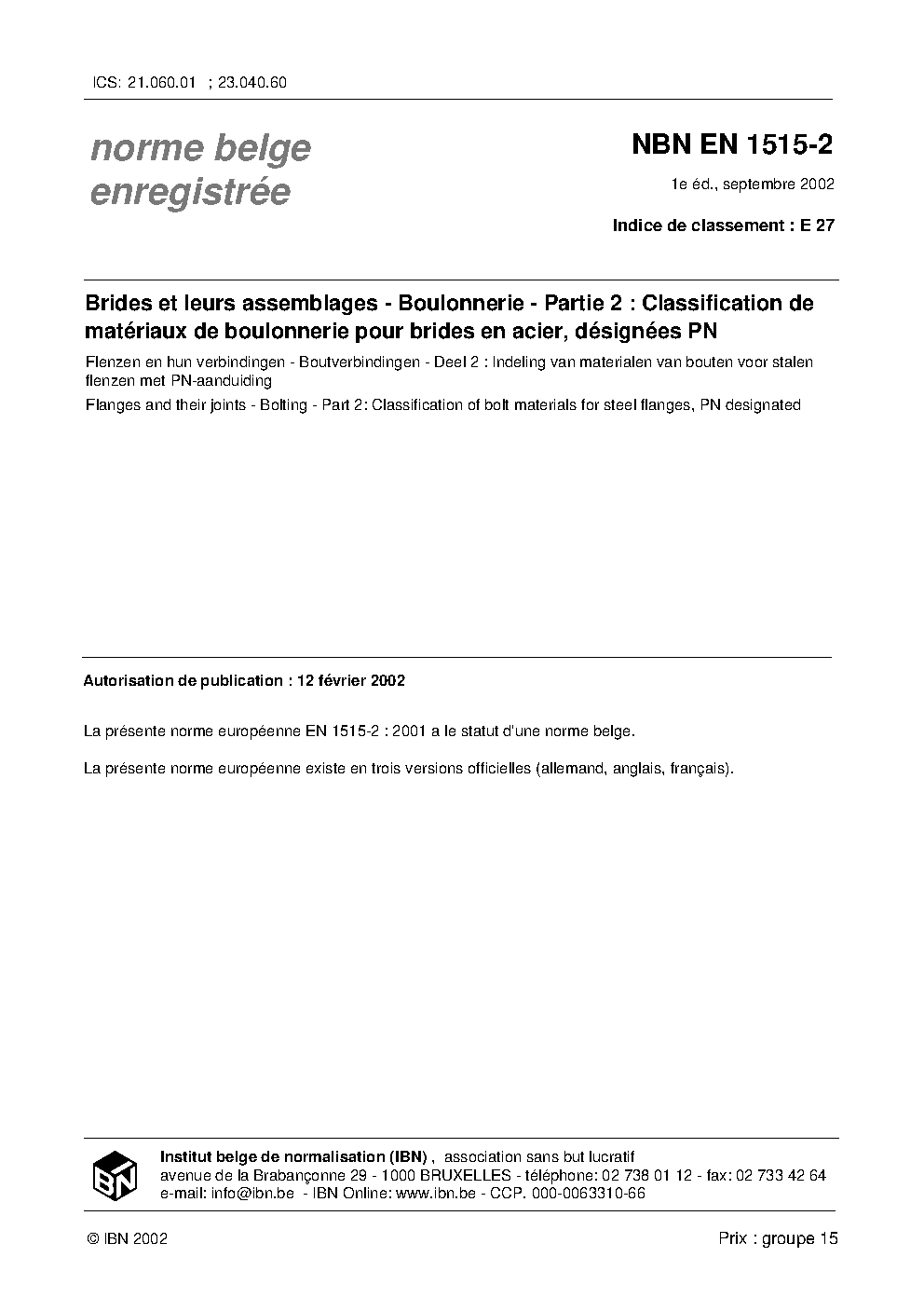 | Publisher | Bureau de Normalisation Belge (NBN) |