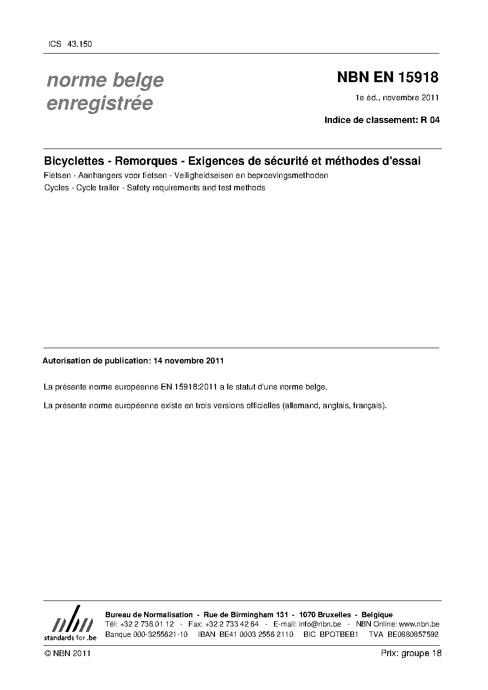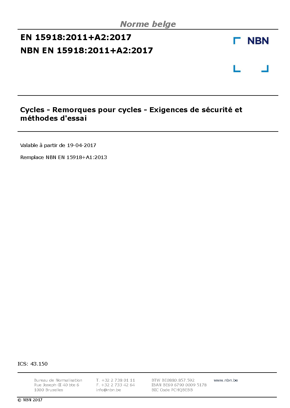 Cycles - Remorques pour cycles - Exigences de sécurité et méthodes d'essai