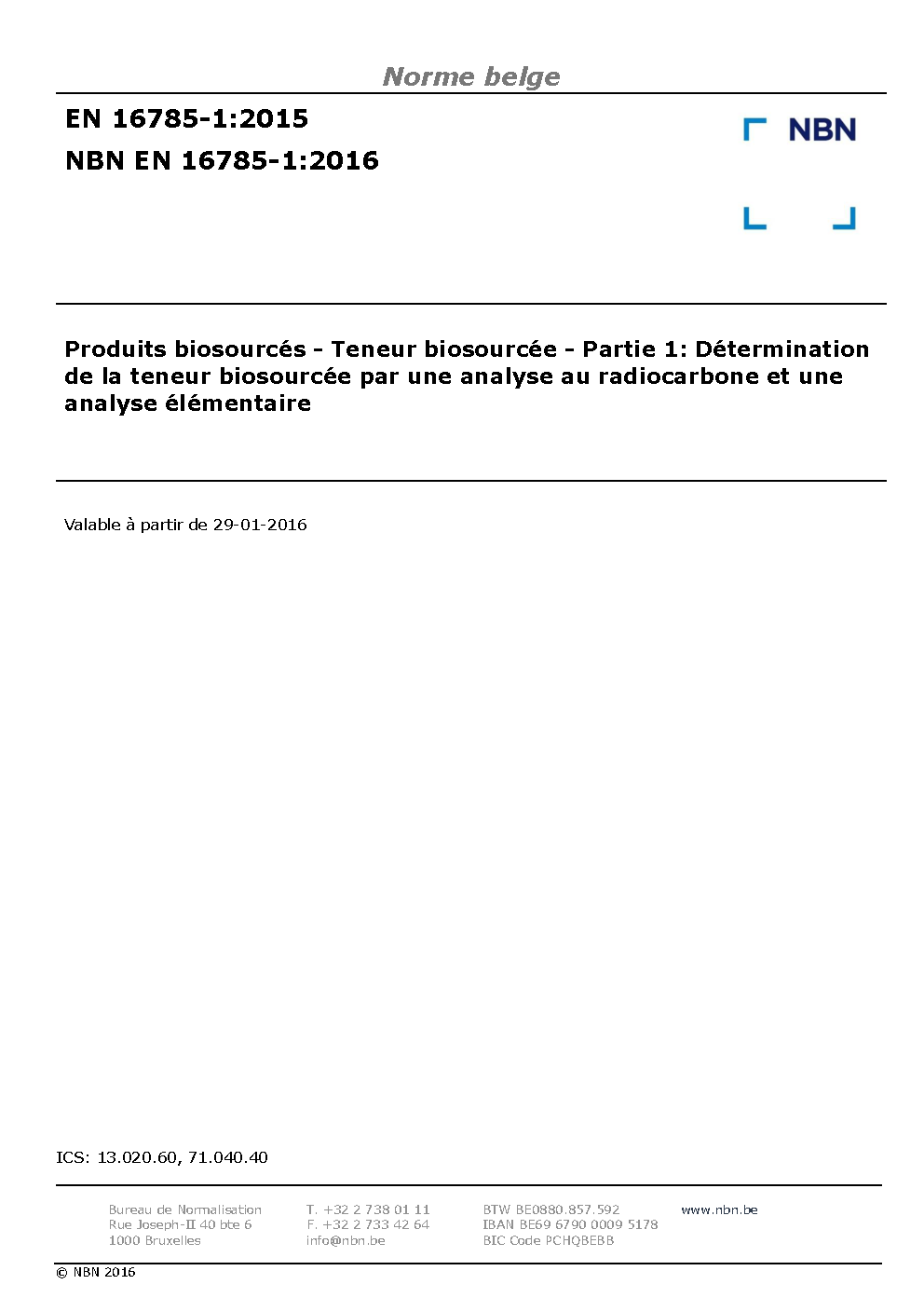 This European Standard specifies a method of determining the bio-based content in products, based on the radiocarbon analysis and elemental analysis.