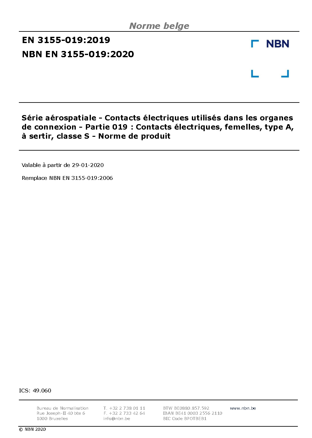 This standard specifies the required characteristics, tests and tooling applicable to female contacts 019, type A, crimp, class S, used in elements of connection according to EN 3155-002.