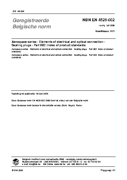 Aerospace series - Elements of electrical and optical connection - Sealing plugs - Part 002: Index of product standards