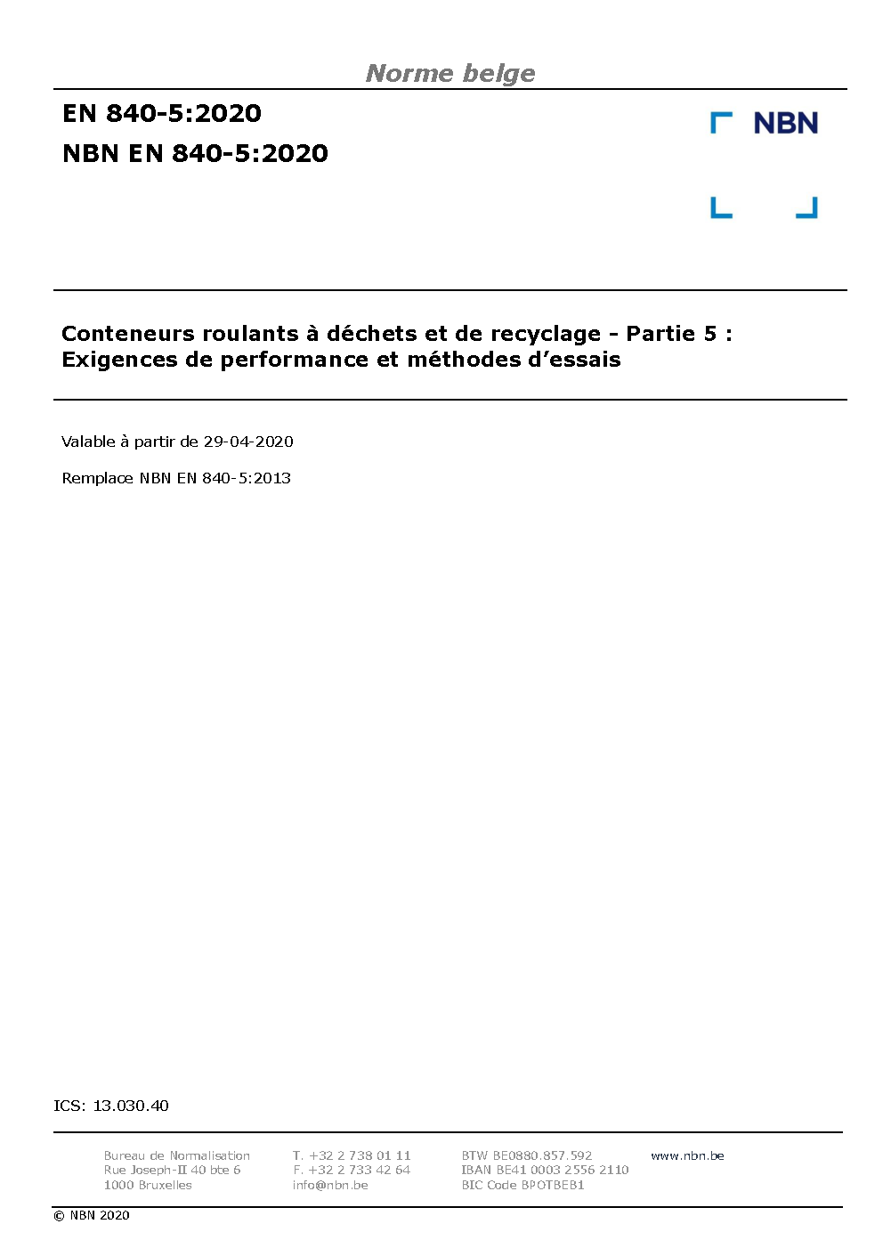 This European Standard gives the test methods for mobile waste and recycling containers according to EN 840-1 to EN 840-4. It also gives the levels to be reached during the tests or after they have been done.
