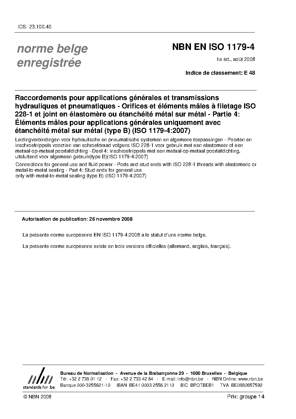 ISO 1179-4:2007 specifies dimensions, performance requirements and test procedures for stud ends with ISO 228-1 threads and metal-to-metal sealing for general use only. These stud ends should not be used for leak-free hydraulic fluid power applications.