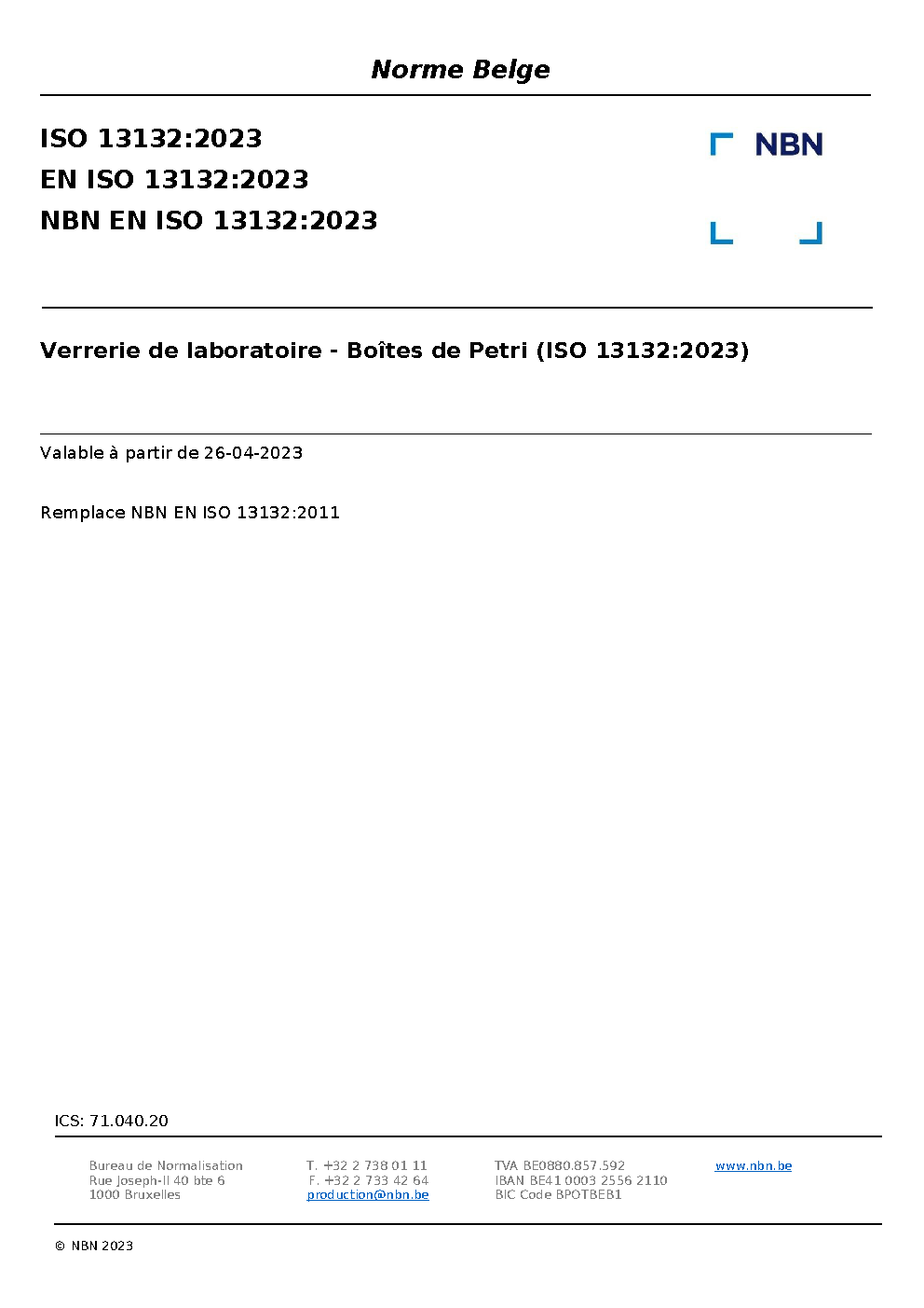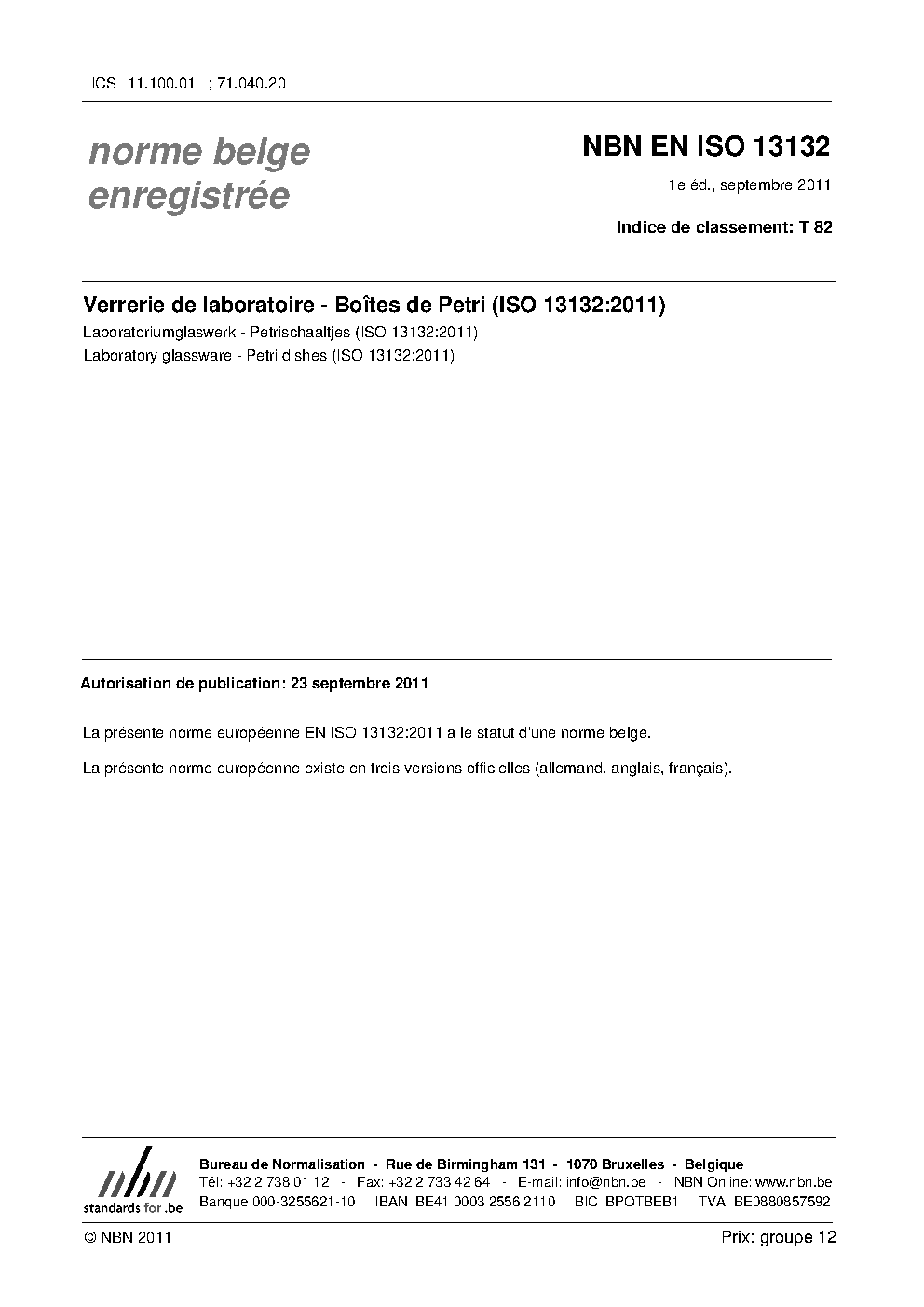ISO 13132:2011 specifies requirements and tests for glass Petri dishes intended for general laboratory purposes and microbiological work.
