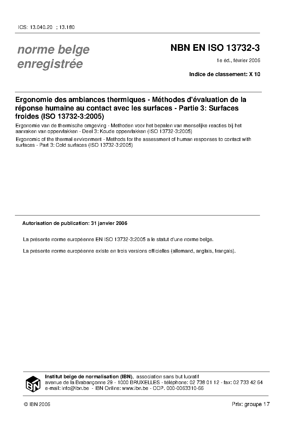 Ergonomic of the thermal environment - Methods for the assessment of human responses to contact with surfaces - Part 3: Cold surfaces (ISO 13732-3:2005)