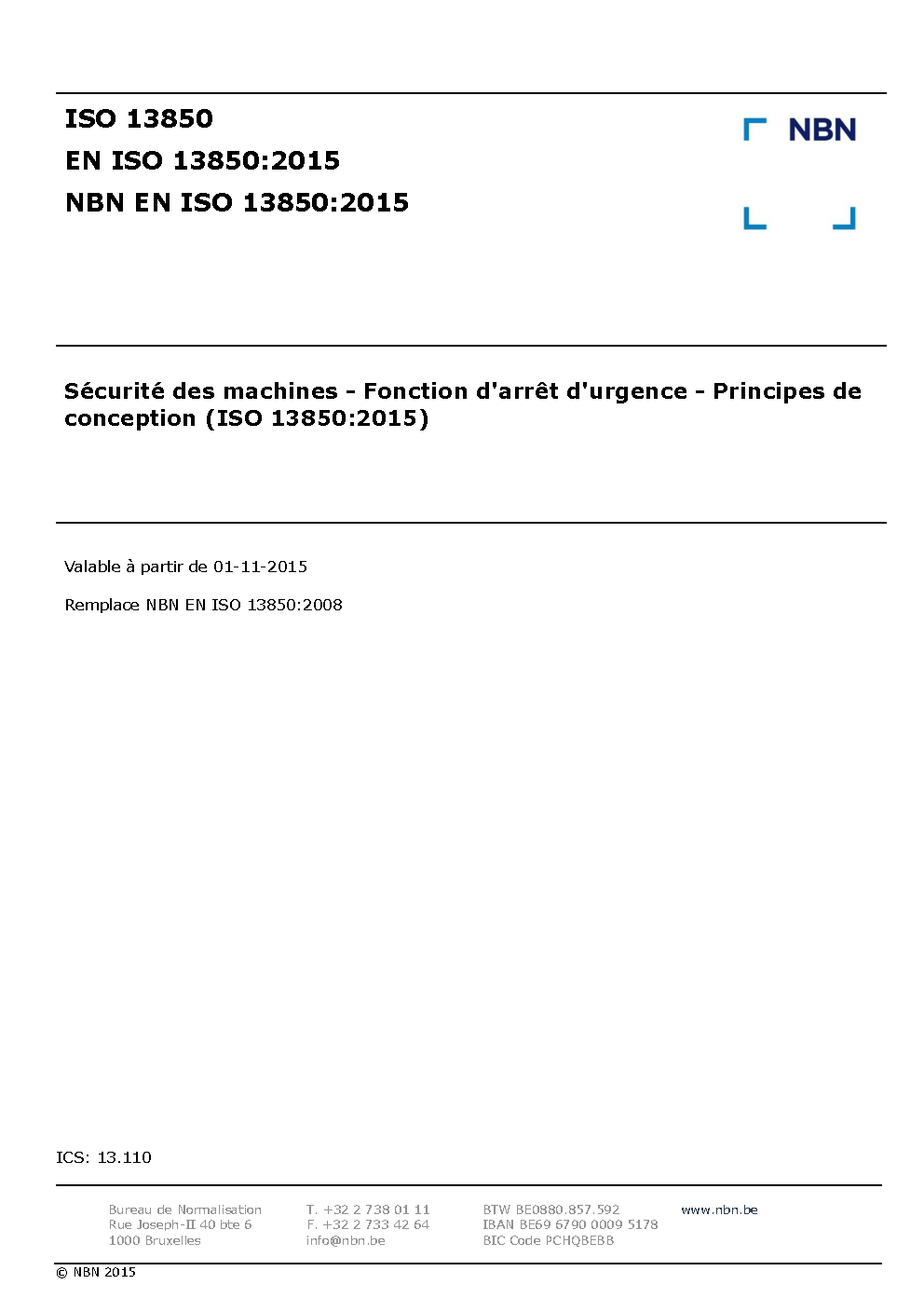 Safety of machinery - Emergency stop function - Principles for design (ISO 13850:2015)