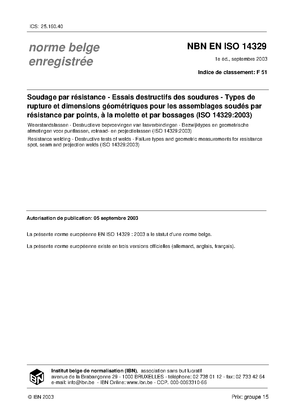ISO 14329:2003 specifies the definitions of the geometric measurements and fracture types to be used in relation to the testing of resistance spot, projection and seam welds in which different loading configurations cause different stress distributions in the weld. The aim of these definitions is to give a base for all other related standards.