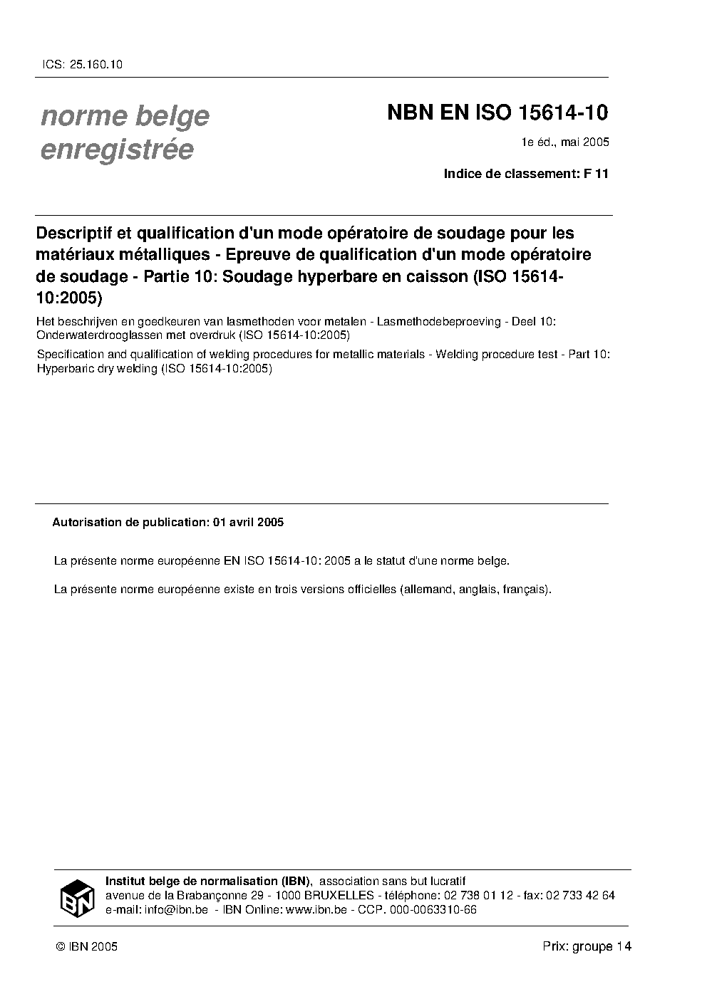 Specification and qualification of welding procedures for metallic materials - Welding procedure test - Part 10: Hyperbaric dry welding (ISO 15614-10:2005)