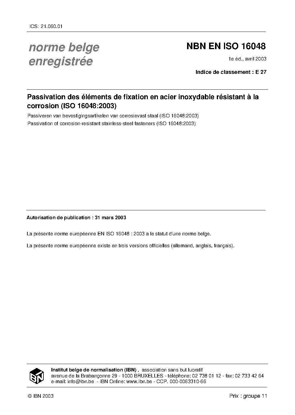 ISO 16048 specifies the methods most often used for passivation of corrosion-resistant stainless steel fasteners.