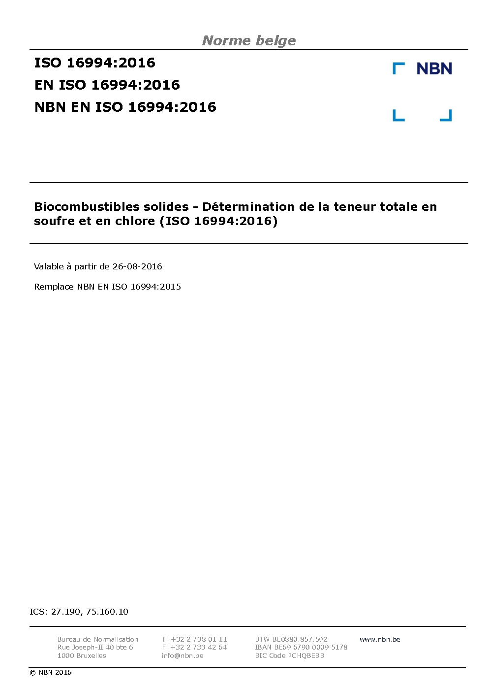Solid biofuels - Determination of total content of sulfur and chlorine (ISO 16994:2015)