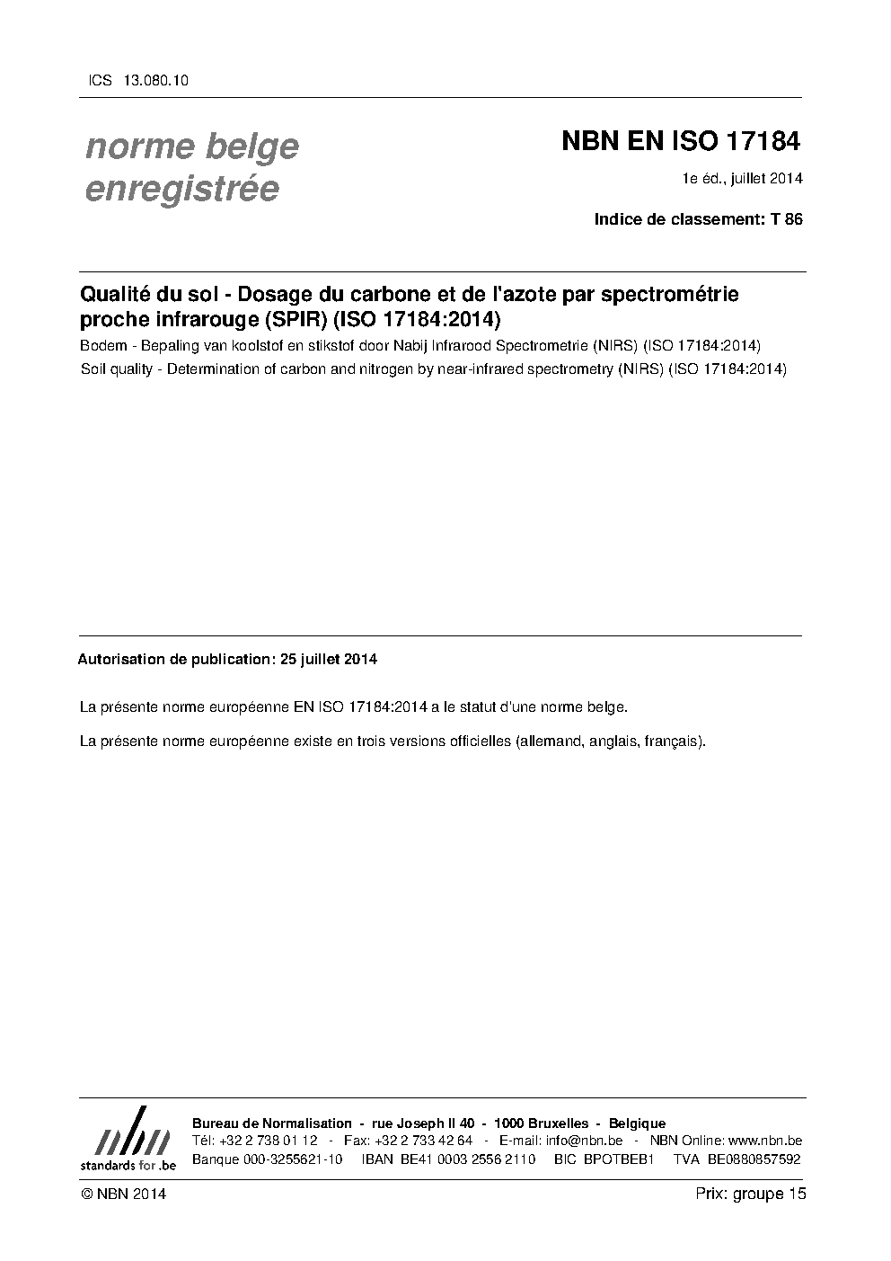 Soil quality - Determination of carbon and nitrogen by near-infrared spectrometry (NIRS) (ISO 17184:2014)