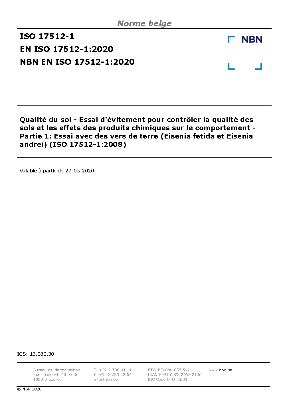 ISO 17512-1:2008 specifies a rapid screening method for evaluating the habitat function of soils and the influence of contaminants and chemicals on earthworm behaviour.