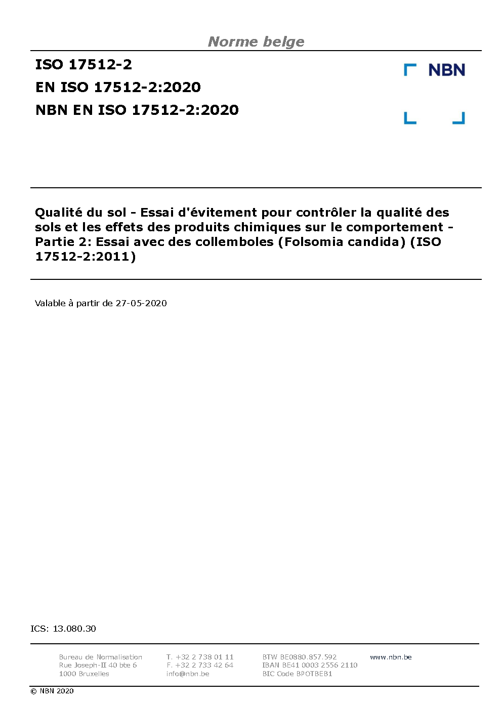 ISO 17512-2:2011 specifies a rapid screening method for evaluating the habitat function of soils based on the avoidance behaviour of springtails.