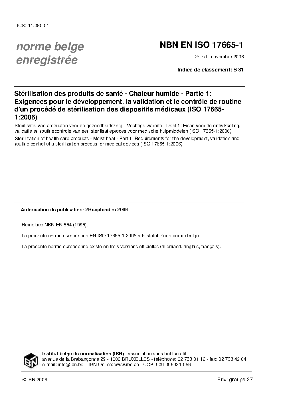 Sterilization of health care products - Moist heat - Part 1: Requirements for the development, validation and routine control of a sterilization process for medical devices (ISO 17665-1:2006)