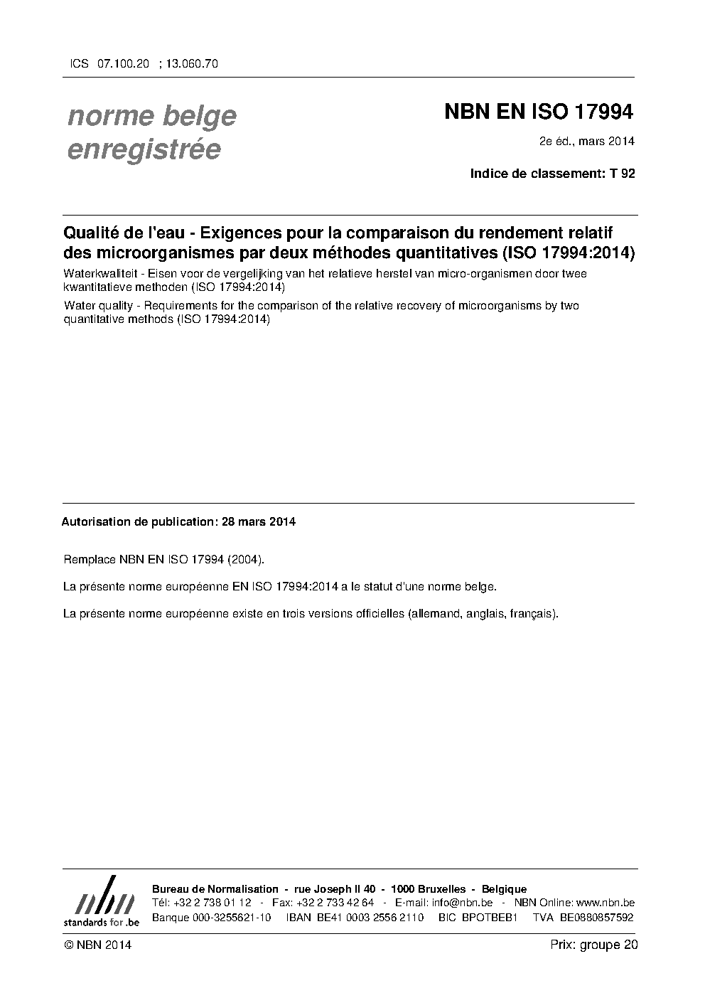 Water quality - Requirements for the comparison of the relative recovery of microorganisms by two quantitative methods (ISO 17994:2014)