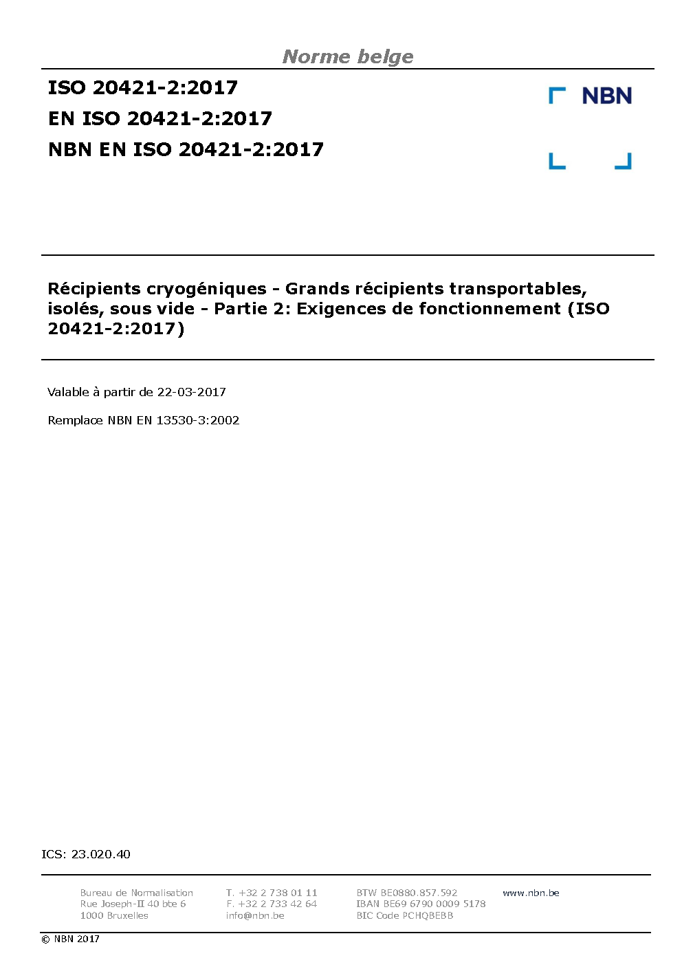 ISO 20421-2:2017 specifies operational requirements for large transportable vacuum-insulated cryogenic vessels.
