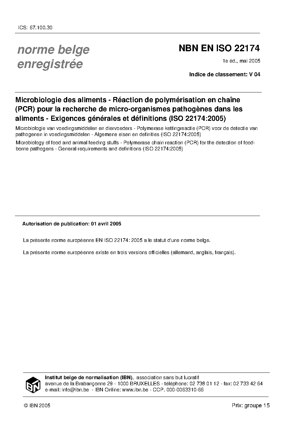 ISO 22174:2004 gives the general requirements for the in vitro amplification of nucleic acid sequences (DNA or RNA). It is applicable to the testing of foodstuffs and isolates obtained from foodstuffs for food-borne pathogens using the polymerase chain reaction (PCR)