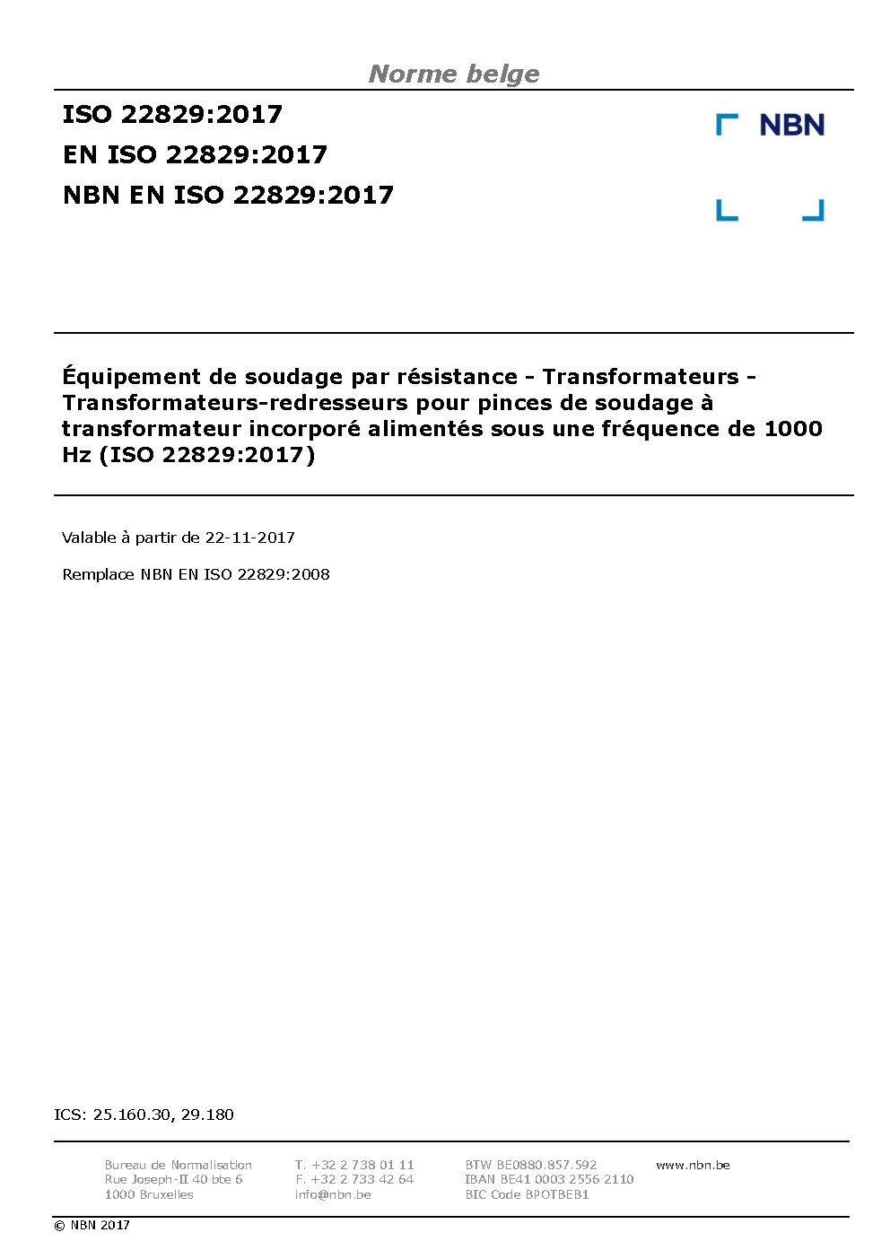 ISO 22829:2007 is applicable to transformer-rectifier units as used in electric resistance welding machines operating from a power supply with a frequency of 1 000 Hz, and of a rated value of the input voltage equal to or higher than 500 V. These transformer-rectifier units are primarily used in welding guns with an integrated transformer.