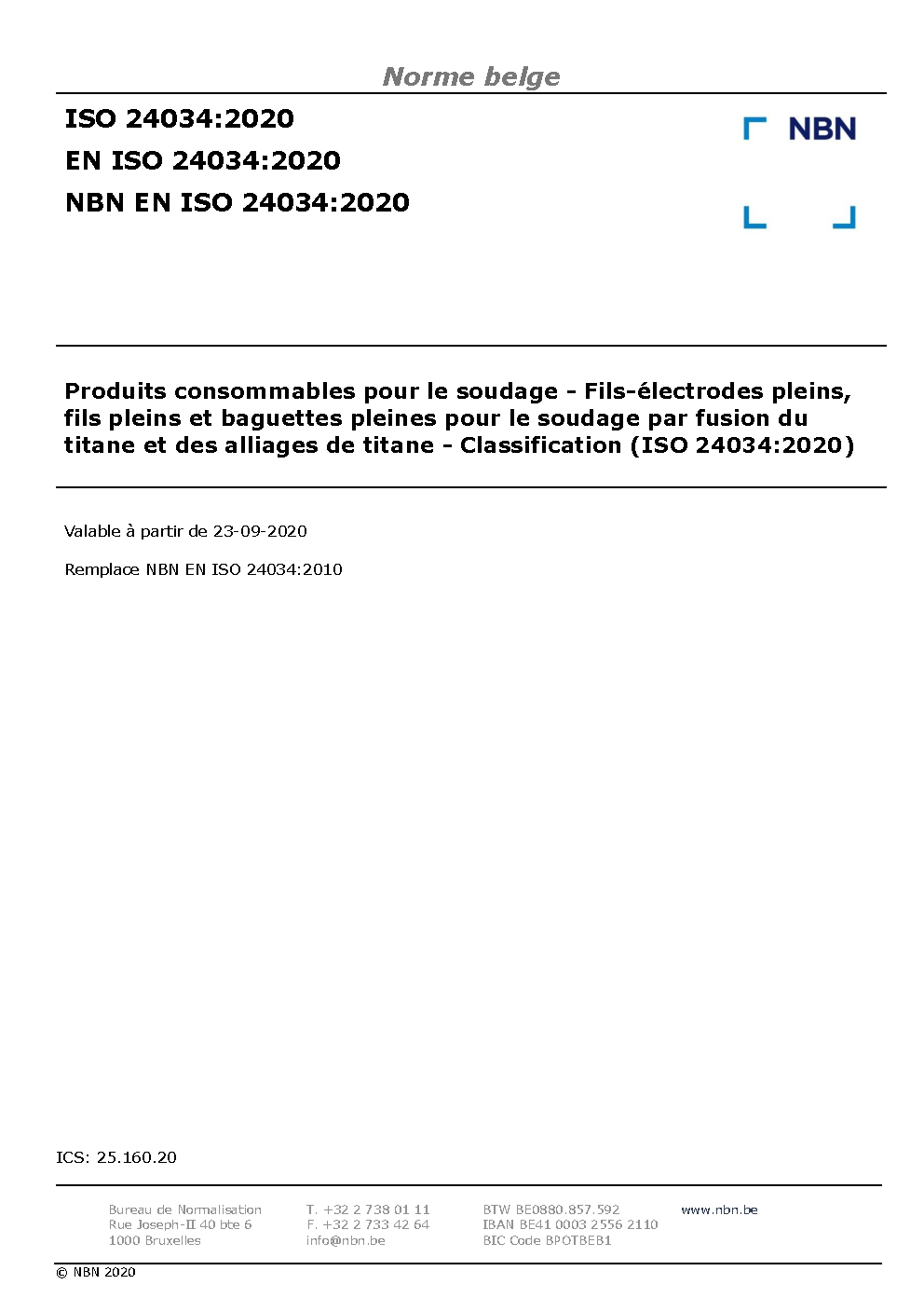Welding consumables - Solid wire electrodes, solid wires and rods for fusion welding of titanium and titanium alloys - Classification (ISO 24034:2020)
