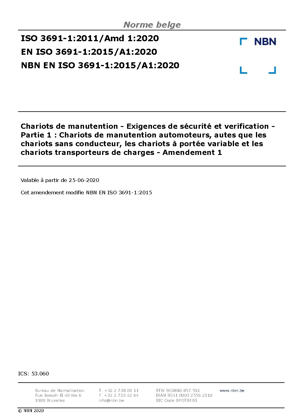 Industrial trucks - Safety requirements and verification - Part 1: Self-propelled industrial trucks, other than driverless trucks, variable-reach trucks and burden-carrier trucks - Amendment 1 (ISO 3691-1:2011/Amd 1:2020)