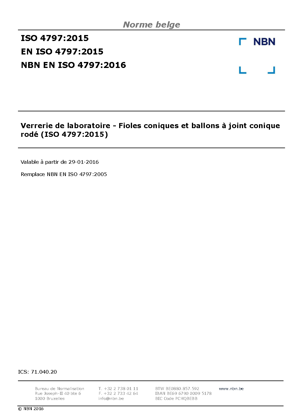 ISO 4797:2015 specifies requirements for an internationally acceptable series of boiling flasks with conical ground joints for general laboratory purposes.
