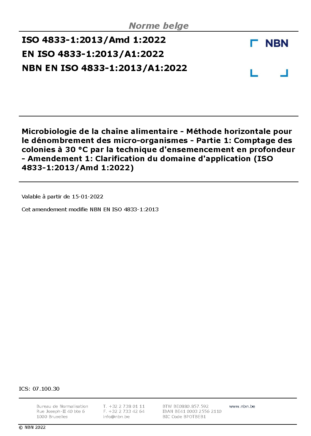 Microbiology of the food chain - Horizontal method for the enumeration of microorganisms - Part 1: Colony count at 30 °C by the pour plate technique - Amendment 1: Clarification of scope (ISO 4833-1:2013/Amd 1:2022)