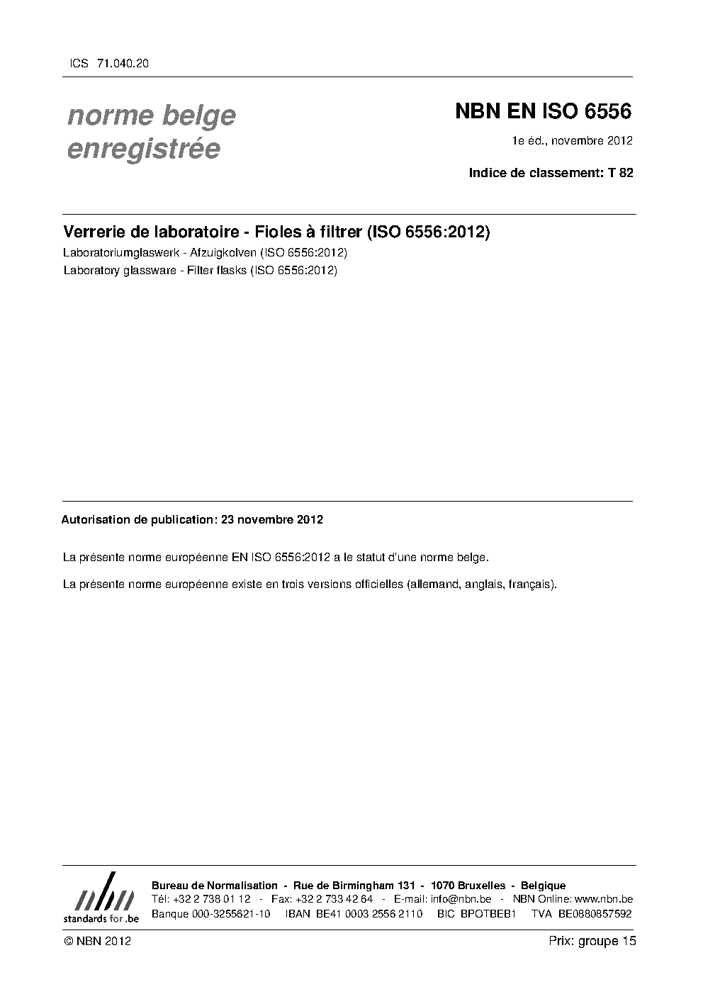 ISO 6556:2012 specifies requirements to filter flasks with conical or cylindrical shape for general laboratory purposes.