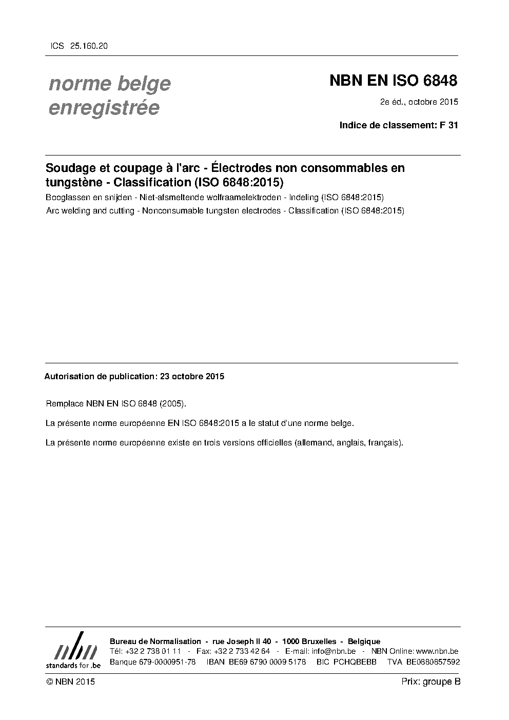 Arc welding and cutting - Nonconsumable tungsten electrodes - Classification (ISO 6848:2015)