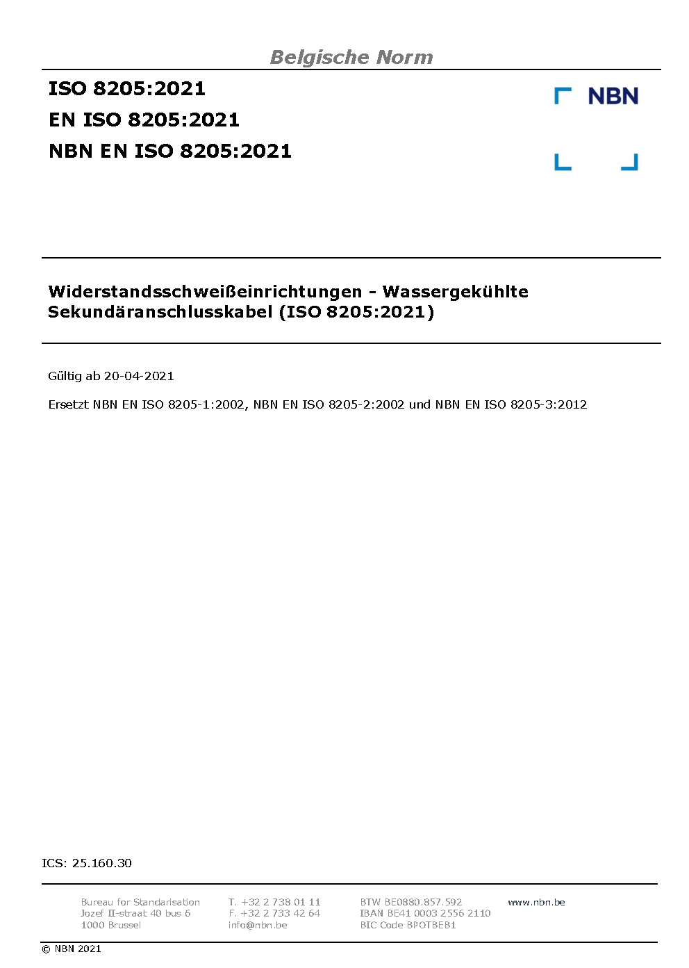 Resistance welding equipment - Water-cooled secondary connection cables(ISO 8205:2021)