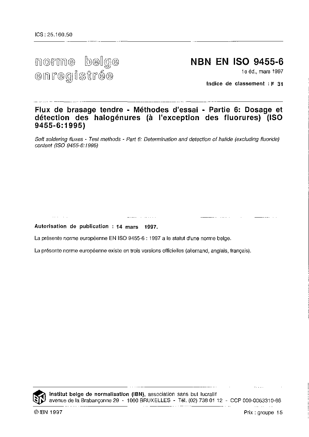 Soft soldering fluxes - Test methods - Part 6: Determination and detection of halide (excluding fluoride) content (ISO 9455-6:1995)