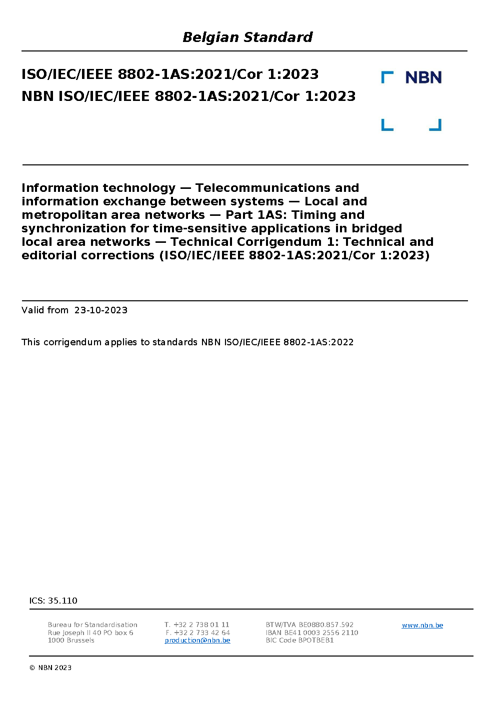 NBN ISO/IEC/IEEE 8802-1AS:2021/Cor 1:2023