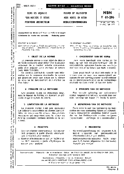 La présente norme a pour objet de décrire un mode opératoire pour déterminer le pouvoir réducteur de la fraction soluble conventionnelle d'un adjuvant pour mortiers et bétons (voir NBN T 61-203).
