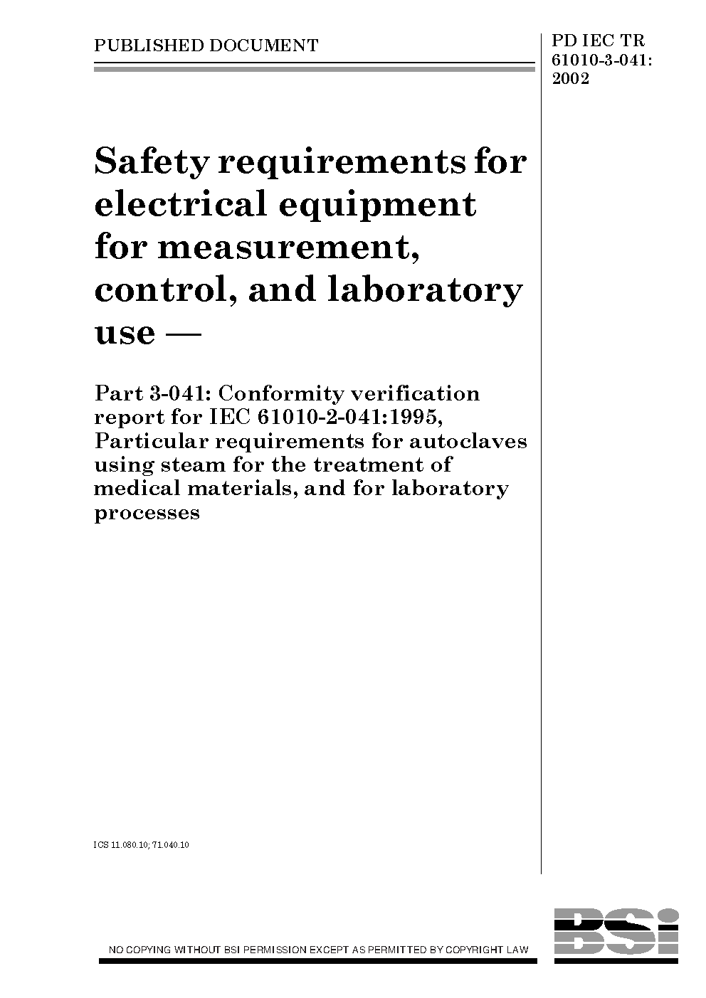 Safety requirements for electrical equipment measurement, control, and laboratory use Conformity verification report IEC 61010-2-041:1995. Particular autoclaves using steam the treatment of medical materials, processes