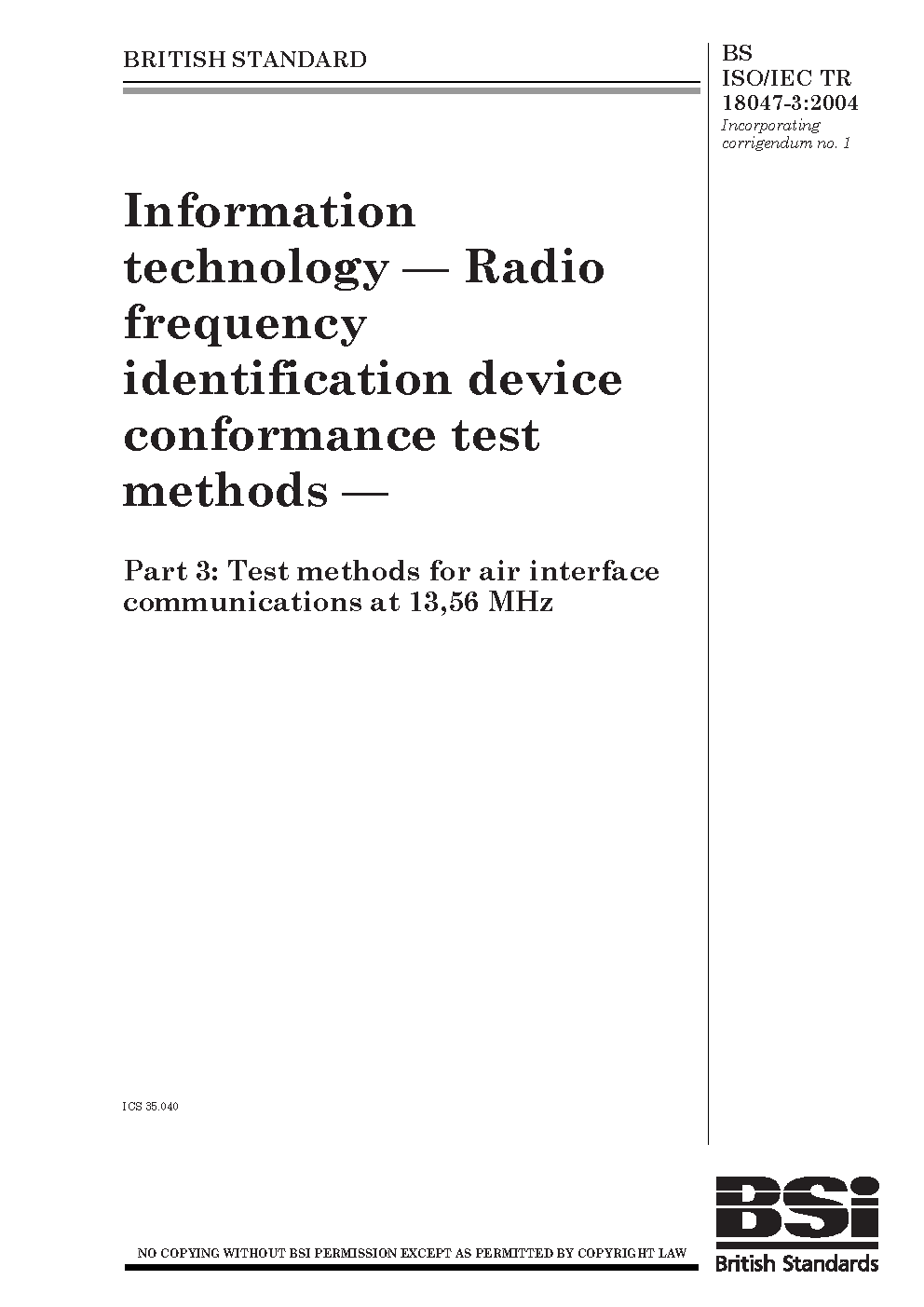 Information technology. Radio frequency identification device conformance test methods Test for air interface communications at 13,56 MHz