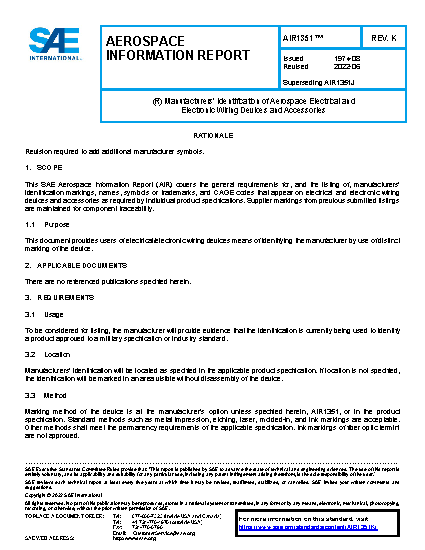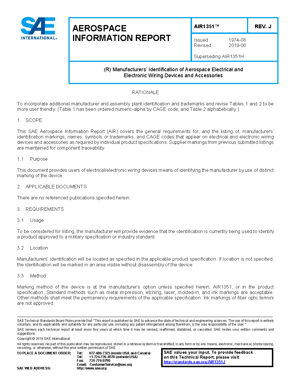 This SAE Aerospace Information Report (AIR) covers the general requirements for, and the listing of, manufacturers’ identification markings, names, symbols or trademarks, and CAGE codes that appear on electrical and electronic wiring devices and accessories as required by individual product specifications. Supplier markings from previous submitted listings are maintained for component traceability.