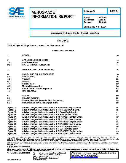 This SAE Aerospace Information Report (AIR) presents data on hydraulic fluids which are of interest to detail designers of hydraulic systems and components for aerospace flight vehicles.