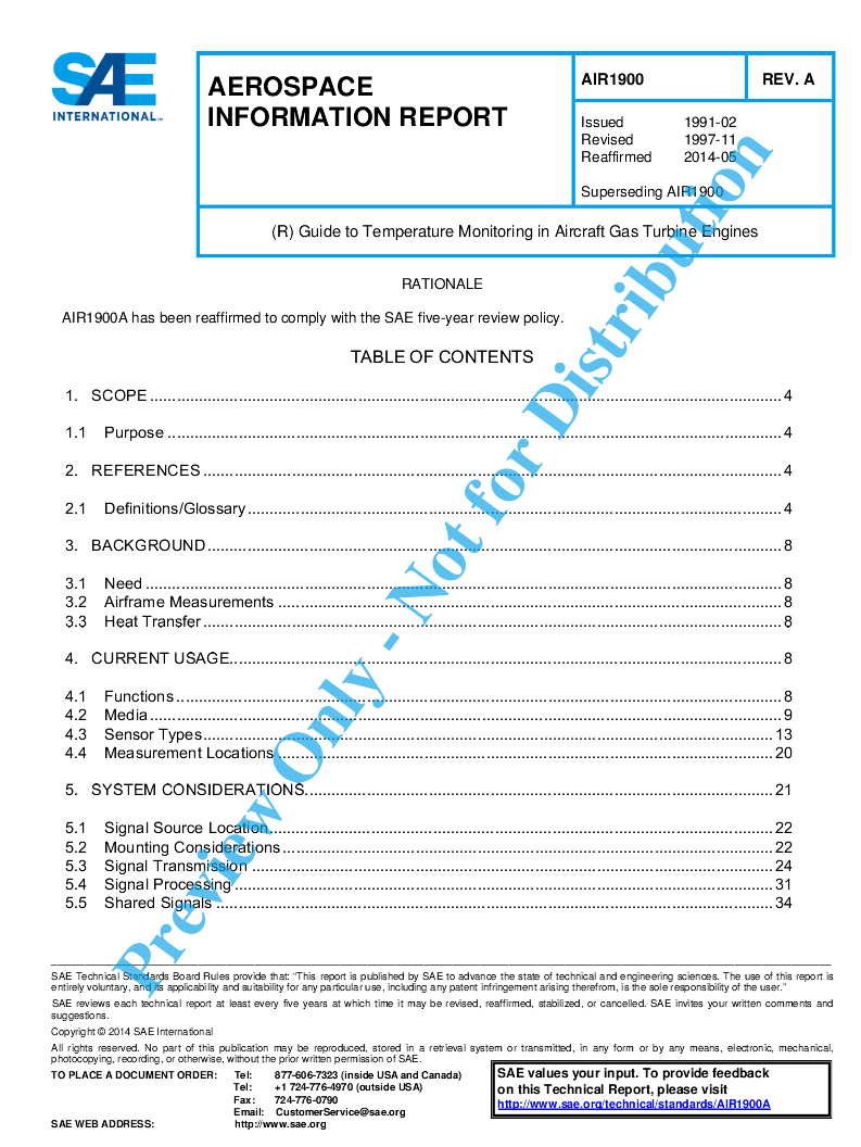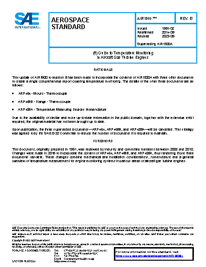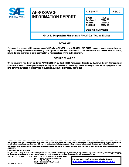 This SAE Aerospace Information Report (AIR) provides an overview of temperature measurement for engine monitoring systems in various areas of aircraft gas turbine engines while focusing on current usage and methods, systems, selection criteria, and types of hardware. This document emphasizes temperature monitoring for diagnostics and condition monitoring purposes.