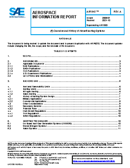 This AIR deals with the three methods of fuel tank inerting systems currently used in operational aircraft: (1) on-board inert gas generation systems (OBIGGS), (2) liquid/gaseous nitrogen systems and (3) Halon systems. The OBIGGS and nitrogen systems generally are designed to provide full-time fuel tank fire protection; the Halon systems generally are designed to provide only on-demand or combat-specific protection.