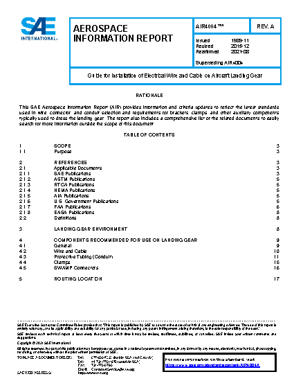 Recent field experience has indicated significant problems with some types of wire and cables as routed on aircraft landing gear. This SAE Aerospace Information Report (AIR) is intended to identify environmental concerns the designer should consider, materials that appear to be most suitable for use in these areas, routing, clamping, and other protection techniques that are appropriate in these applications. In recent years aircraft certification regulatory agencies introduced new regulations regarding Electrical Wiring Interconnection Systems (EWIS) to further enhance safety of the associated systems and aircraft overall.
