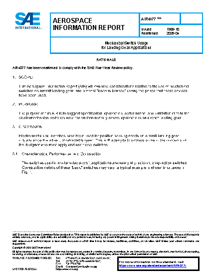 This Aerospace Information Report (AIR) will examine considerations relative to the use of mechanical switches on aircraft landing gear, and present "lessons learned" during the period that these devices have been used.