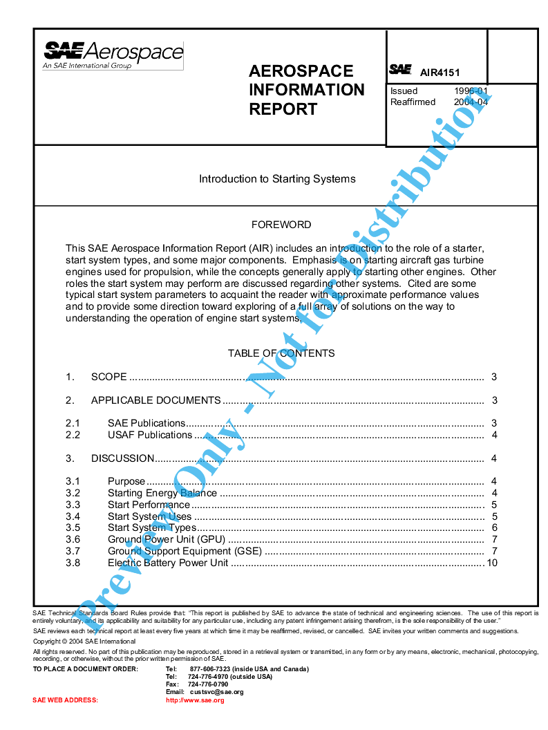 This SAE Aerospace Information Report (AIR) covers basic aircraft engine start systems fundamentals. It presents various ground power sources and aircraft “on board” starting units. Also included are descriptions of start system components and interconnections which together comprise an engine starting system.