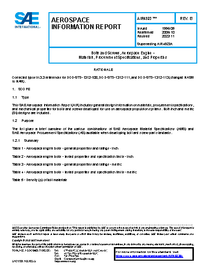 This SAE Aerospace Information Report (AIR) includes general design information on materials, procurement specifications, and mechanical properties for bolts and screws developed for use on aerospace propulsion systems. Both inch and metric (SI) designs are included.