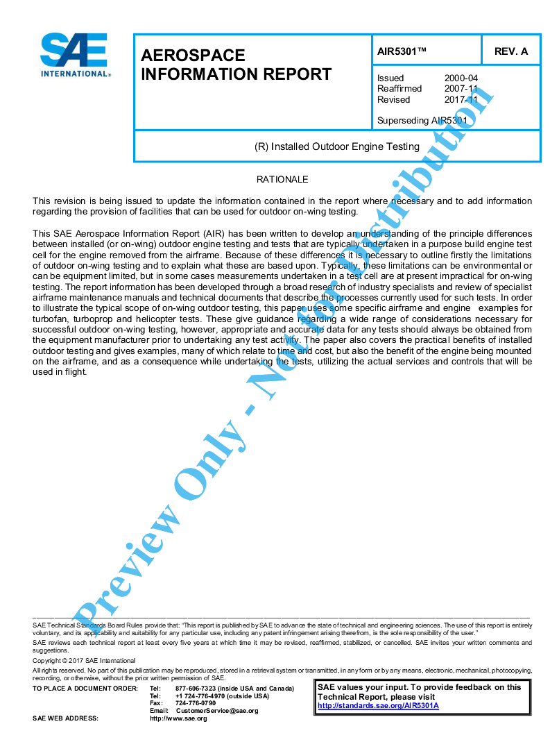 This SAE Aerospace Information Report (AIR) was written because of the growing interest in aircraft installed outdoor engine testing by the Federal Aviation Administration, airlines, charter/commercial operators, cargo carriers, engine manufacturers and overhaul and repair stations. This document was developed by a broad cross section of personnel from the aviation industry and government agencies and includes information obtained from a survey of a variety of operators of fixed and rotary wing aircraft and research of aircraft and engine maintenance manuals.