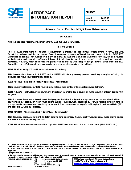 The candidate thrust methods build on the work presented in AIR1703. The document includes a comprehensive uncertainty assessment conducted per AIR1678 to identify the major thrust determination options. Fundamental to this uncertainty assessment are the influence coefficients relating in-flight thrust calculation uncertainty to the measured parameters and derived coefficients. These influence coefficients were developed from three typical public domain, generic engine cycle models.