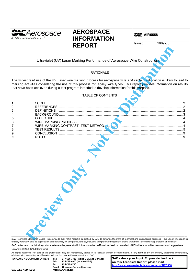 The purpose of this report is to provide information on the results of ultra violet (UV) laser marking and mark contrast measurement of a wide range of aerospace wire and cable constructions, the specifications for most of which do not state specific requirements for laser markability. The contents of this document are for information and guidance only. It is not intended that it be used as the basis for marking process specifications or standards, which are covered by AS5649 Wire and Cable Marking Process, UV Laser.