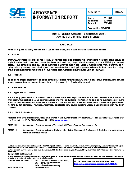 This SAE Aerospace Information Report (AIR) is intended to provide guidelines to tightening methods and torque values as applied to electrical connectors, related hardware and switches, relays, circuit breakers and A-A-59125 type terminal boards. The connectors and associated hardware discussed herein, are typically manufactured from aluminum alloy, high grade engineering thermoplastics or corrosion resistant steel and typically plated with a protective/conductive coating. These guidelines may be used where no rules have been mandated either contractually or otherwise.