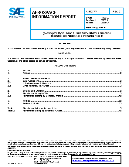This SAE Aerospace Information Report (AIR) lists military and industry specifications, standards, recommended practices and information reports used in the design of aerospace hydraulic and pneumatic components and systems. It is intended as a supplement to specifications ARP4752, AS5440, and MIL-P-5518. Only those hardware standards specifically applicable to hydraulic or pneumatic components or systems are listed in this document.