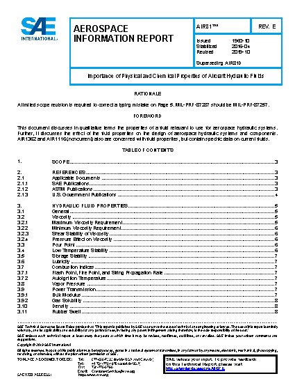 This document discusses the relative merits of the physical and chemical properties of hydraulic fluids in relation to the aerospace hydraulic system design, and the related materials compatibility. The discussion in this report applies both to hydrocarbon and phosphate ester based aircraft hydraulic fluids. In some cases, numerical limits are suggested, but, in general, the significance and effect of a property is noted qualitatively.