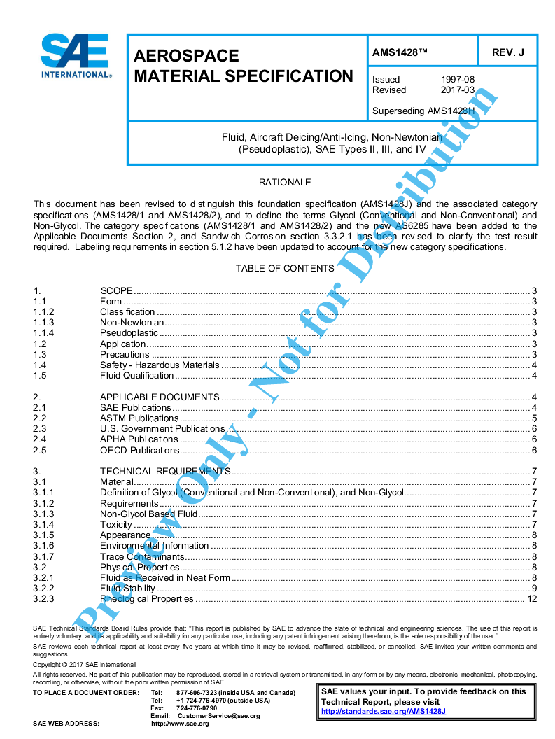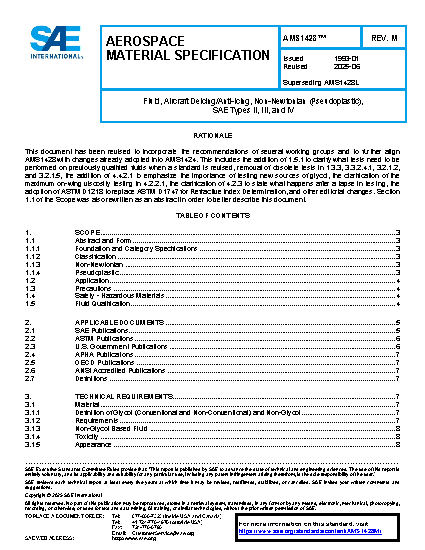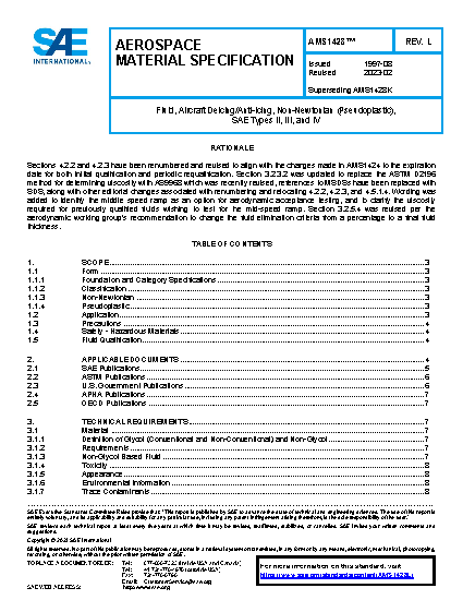 This foundation specification (AMS1428K) and its associated category specifications (AMS1428/1 and AMS1428/2) cover three types of deicing/anti-icing fluids, each in the form of a non-Newtonian fluid.